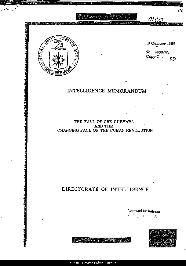 CIA, The Fall of Che Guevara and the Changing Face of the Cuban Revolution, October 18, 1965: This intelligence memorandum, written by a young CIA analyst, Brian Latell, presents an assessment that Guevara's preeminence as a leader of the Cuban revolution has waned, and his internal and international policies have been abandoned. In domestic policy, his economic strategy of rapid industrialization has "brought the economy to its lowest point since Castro came to power," the paper argues. In foreign policy, he "never wavered from his firm revolutionary stand, even as other Cuban leaders began to devote most of their attention to the internal problems of the revolution." With Guevara no longer in Cuba, the CIA's assessment concludes, "there is no doubt that Castro's more cautious position on exporting revolution, as well as his different economic approach, led to Che's downfall."
